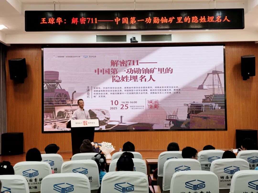 10月25日,“解密711——中国第一功勋铀矿里的隐姓埋名人”主题讲座在湖南图书馆举行。活动特邀中国作家协会会员、郴州市作家协会主席,《籍贯711:中国核工业第一功勋铀矿的故事》《功勋711》作者王琼华担任主讲嘉宾,与广大读者一起重温“中国核工业第一功勋铀矿”711矿的隐秘荣光,将“干惊天动地事,做隐姓埋名人”的尘封历史和伟大精神呈现给广大读者。